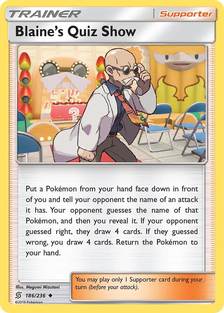 Put a Pokémon from your hand face down in front of you and tell your opponent the name of an attack it has. Your opponent guesses the name of that Pokémon, and then you reveal it. If your opponent guessed right, they draw 4 cards. If they guessed wrong, you draw 4 cards. Return the Pokémon to your hand.